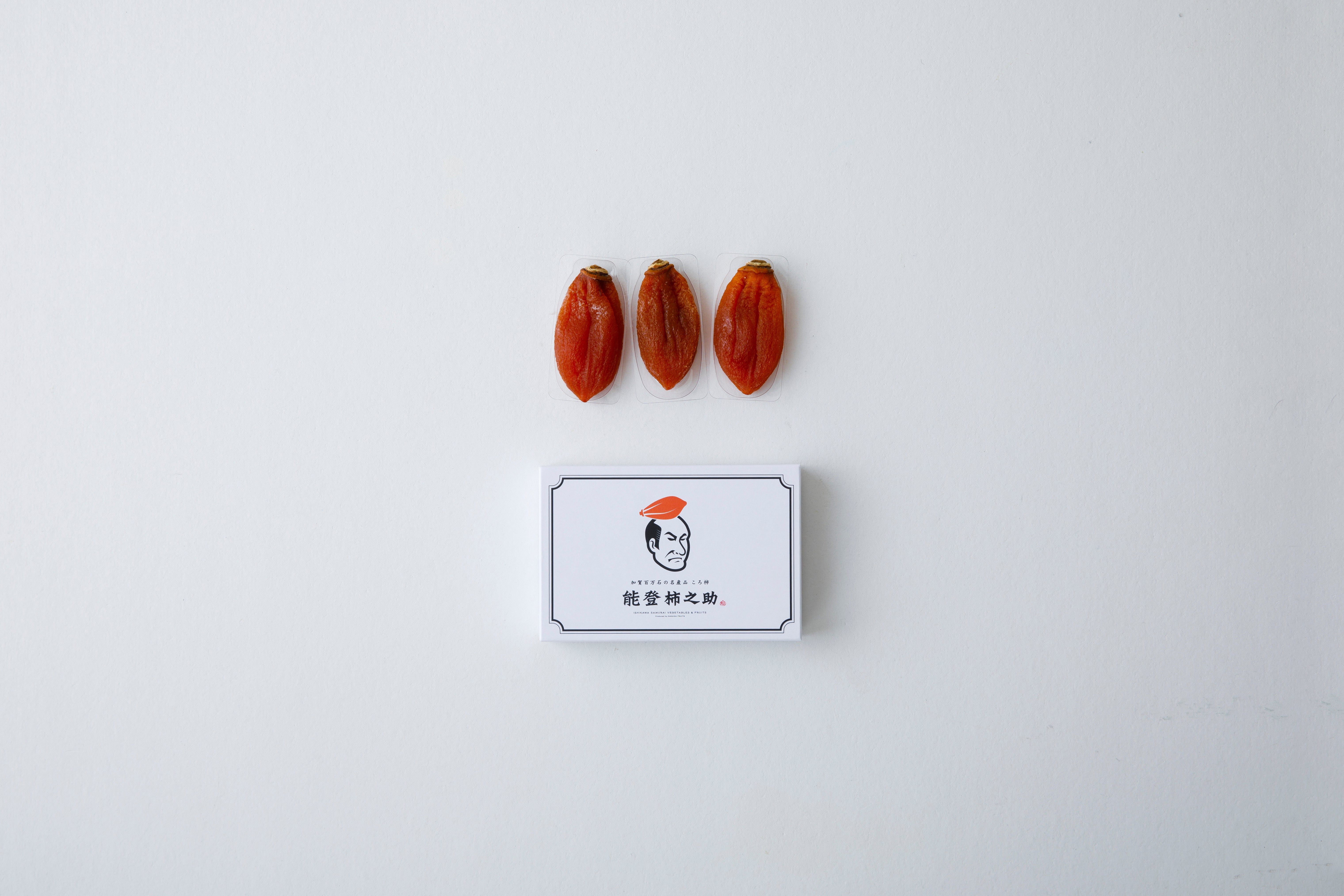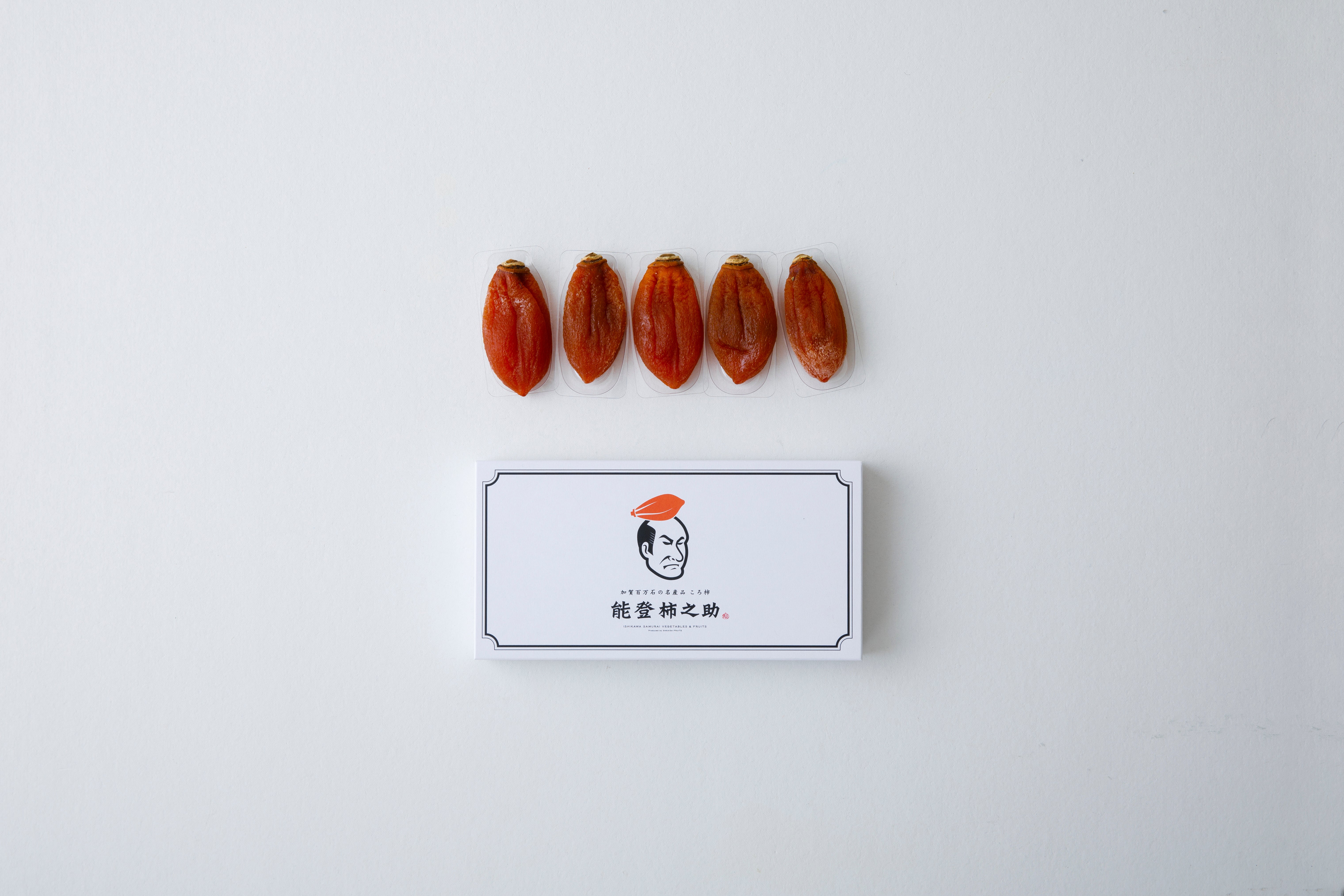 能登の銘品「能登志賀ころ柿」を加工を行い、年間を通じて販売を可能にした商品が、この「能登柿之助」です。能登柿之助は、秋口頃に収穫された能登地方の固有の柿「最勝柿」を独自の製法により干しあげた干し柿です。ひとつひとつ手作業にて、加工が施され、能登に吹く寒風で丁寧に乾燥されます。